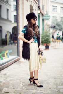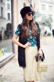 What I’m Wearing: Vintage Blue Floral Blouse, ASOS Mongolian Black Gilet, Zara Heels & Wallet, Vintage Metallic Skirt, Chanel Mini Bag & ASOS Faux Fur Cossack Hat