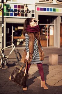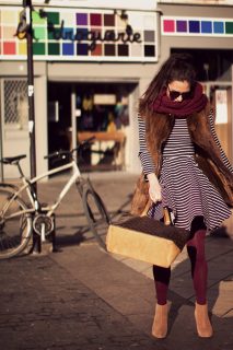 What I’m Wearing: Vintage Gilet, Chicwish Breton Dress, Louis Vuitton Tote, Zara Snood, Tights & Boots