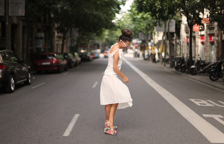 Barcelona in the summer, it’s pretty perfect. Tan-lines on rooftop terraces, afternoons at the beach that accidentally last until sunset & an abundance of delicious healthy food. Handsome men everywhere, and a summer haze covers the city, its relaxing and exhilarating all at the same time. There a lot of reasons why I love this city, mostly because in a lot of the ways, its the opposite of Paris. I like spending my time in two very different places – and when the Parisians start acting too uptight for my liking, I’ll jump over to Spain, where people tend to smile more. And there is something about Barcelona that makes me want to wear white – white dresses, white lace, white bikinis…maybe because summer is here and there is no better shade to showcase the beginnings of my summer tan. I bought this dress in a vintage shop here – I love how simple it is, the drop-waist pleated skirt is so comfortable, plus the perfect garment to showcase my favourite summer shoes; these crazy tropical Primark platforms are such fun. Have you visited Barcelona? Do you love it as much as I do? Come for a visit, we can hang out! Photos: Anouk Lanoo