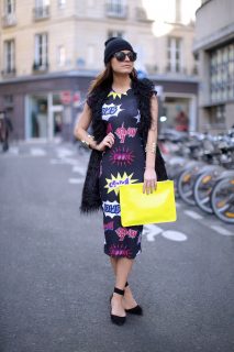 What I’m Wearing: Lavish Alice Comic Dress, ASOS Mongolian Black Gilet, Zara Heels & ASOS Neon Yellow Clutch